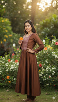 Step into timeless elegance with our Chocolate Brown Vichithra Silk Anarkali Umbrella Kurthi — a perfect blend of tradition and modern charm. Made from premium vichithra silk fabric, this kurthi features a graceful umbrella flare that adds royal volume and a flattering look. Ideal for festive functions, parties, and cultural events.